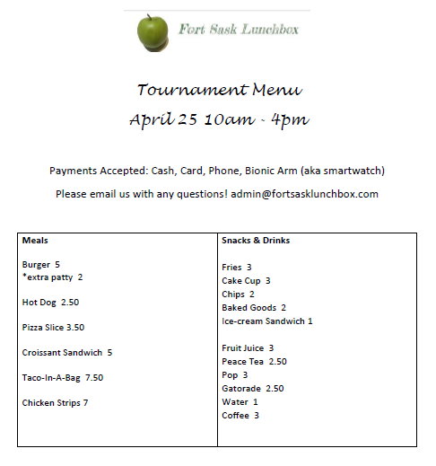 | The Canteen will be open at St. Andre Bessette High School from 10am -4pm | All Teams will be entered for a draw prize as they register. Draw Prizes will be given out throughout the tourament | |||||||||||
